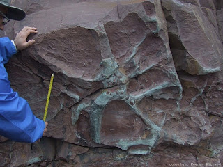 The above picture is very interesting. On the surface you can see multiple tracks made by invertebrates. You can see burrowing, walking, and feeding traces. There's even some resting traces. The maximum width of these traces are about 1 centimeter. Some other traces barely register at 1 millimeter. The following slides are of closeups of these invertebrate traces.